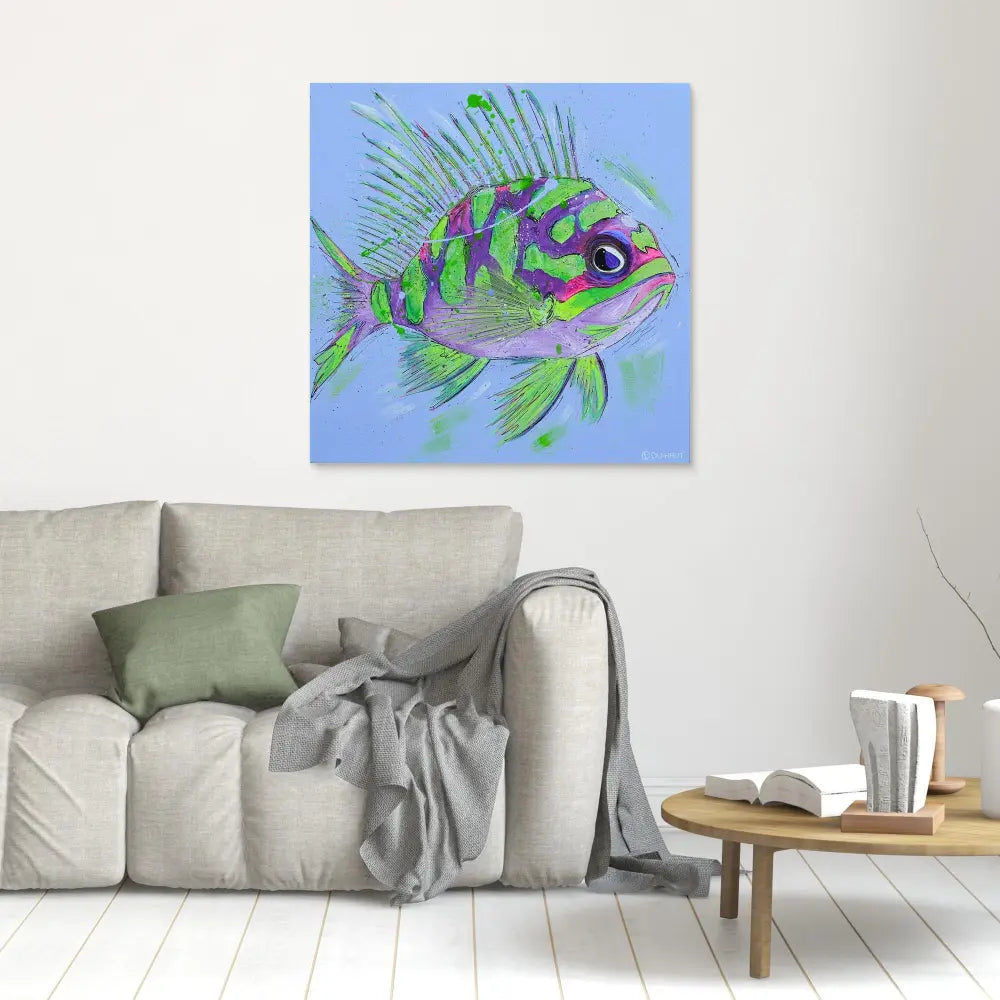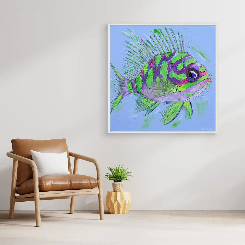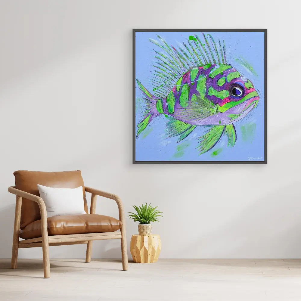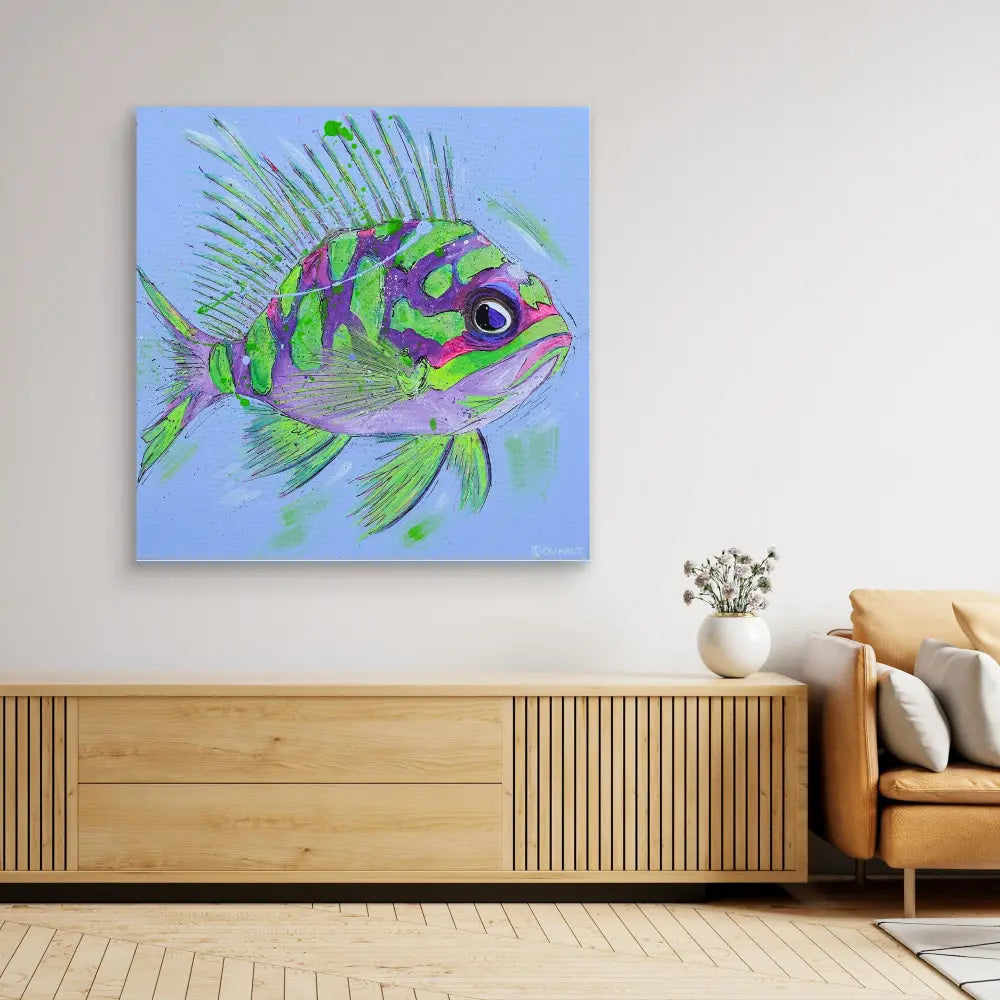 This painting is a playful ode to personality, attitude, and the colorful souls who don’t follow the current.