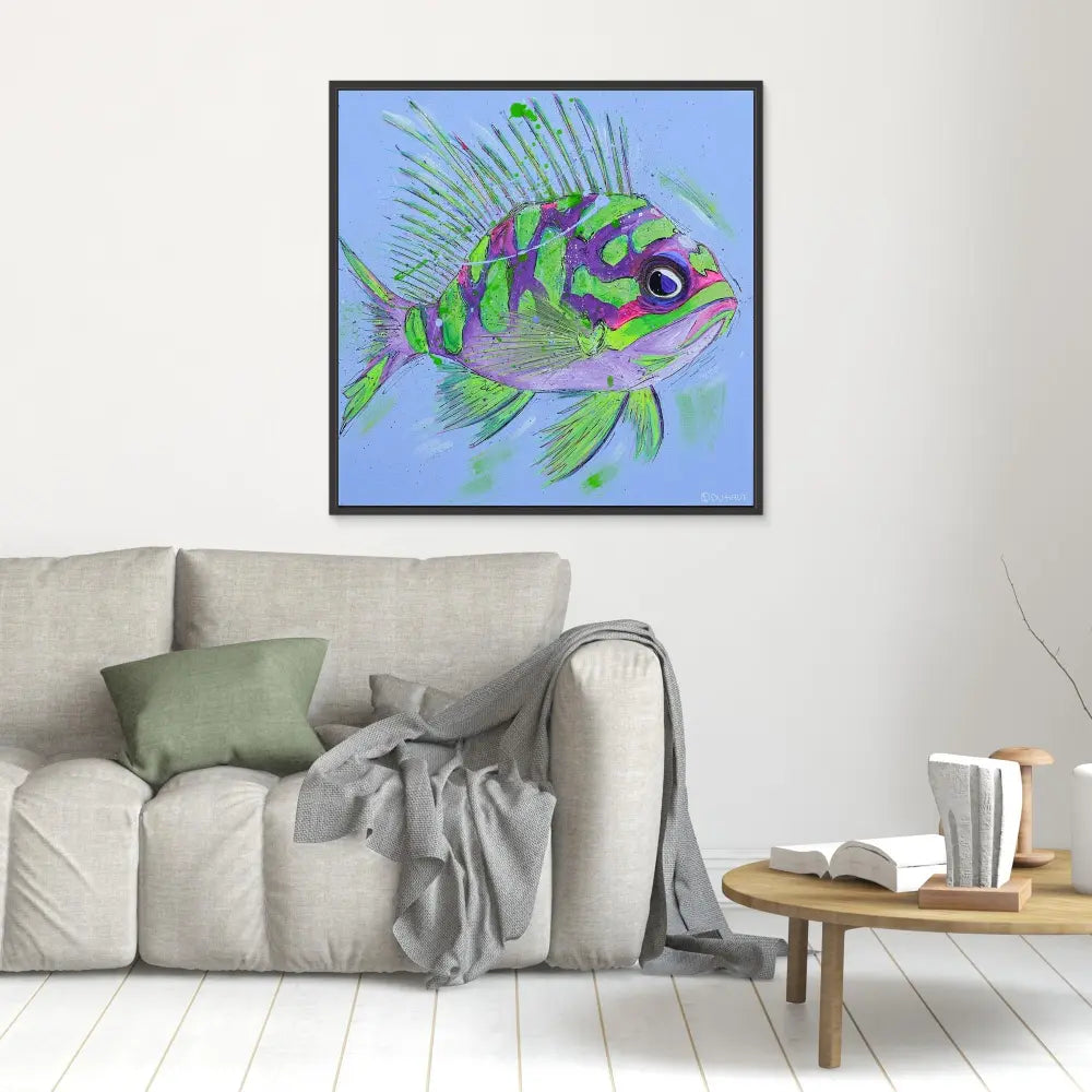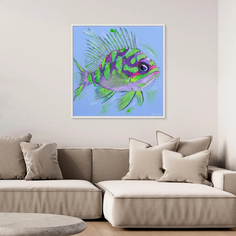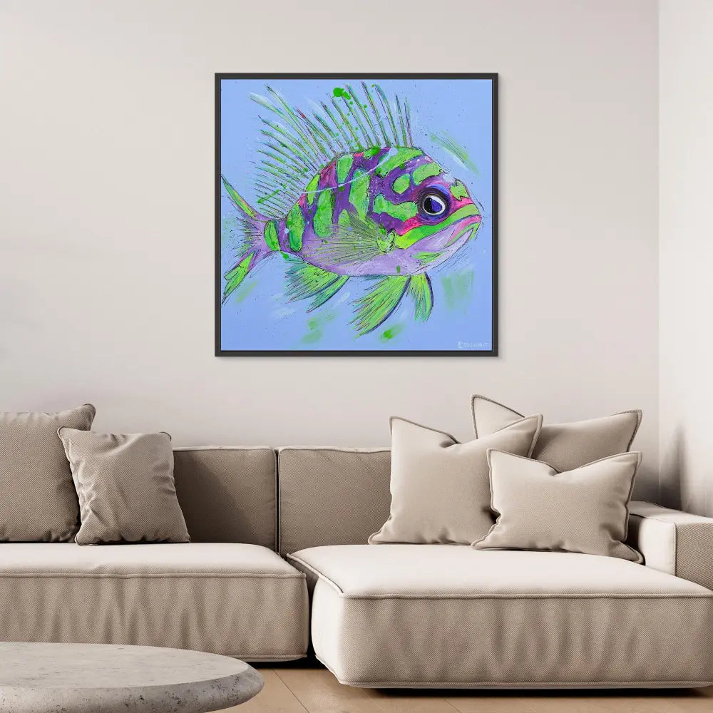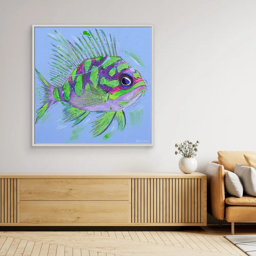 This painting is a playful ode to personality, attitude, and the colorful souls who don’t follow the current.